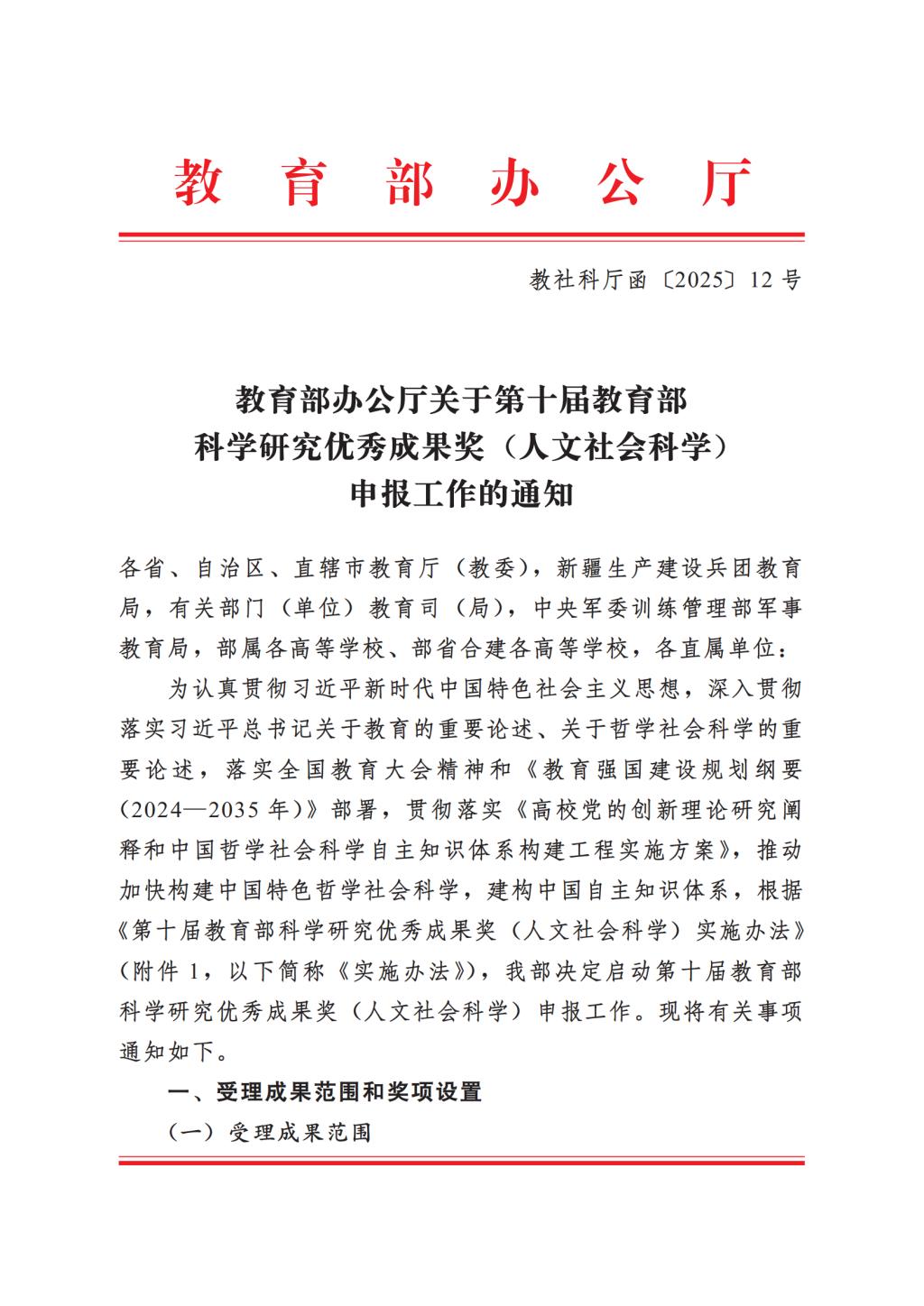 教育部办公厅关于第十届教育部科学研究优秀成果奖(人文社会科学)申报工作的通知