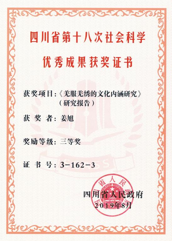 日前,四川省第十八次社会科学优秀成果奖正式向社会公布,该奖项自2000年设立,代表了四川社科领域最高荣誉和最高水平,设荣誉奖、一等奖、二等奖、三等奖,每两年进行一次。此次共评出荣誉奖1项、一等奖20项、二等奖80项、三等奖299项。我校教师詹颖主持撰写,姜旭共同参与的社会科学类成果《羌服羌绣的文化内涵研究》(研究报告,省社科规划项目 2016.11)获得三等奖。