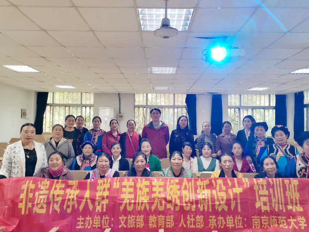 该项目由南京师范大学美术学院视觉传达系主任、博士生导师张犇教授主持。在我校的积极配合支持和理县县委县政府的精心组织安排下,该项目羌族羌绣传承人群的遴选工作于9月初在理县顺利完成,共选出26名理县绣娘作为学员赴南京参加为期一月的培训。我校詹颖博士长期参与理县蒲溪村精准扶贫工作,在羌族工艺美术研究和羌族非遗技艺的保护、传承和文创产品开发等领域有多项成果,此次詹颖博士受邀担任培训班授课专家,为学员开设《羌族羌绣文创产品的设计理念与方法》专题讲座,受到南京师范大学美术学院的热烈欢迎和学员的一致好评。